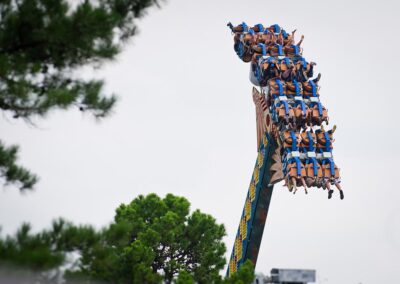 The trip starts with a vertical ascent hitting its peak at 150-feet up in the air. The most talked about highlight of this ride is the thrillingly slow quarter-loop backwards that leaves riders dangling high above the park for a heart-pounding moment before they are sent on a 360-degree corkscrew roll, followed by a plummeting drop at more than 65 mph. You’ll rocket past the station and other guests in line to hit the high peak again, then fall backward through the station and back up the other side of the ride with the back of the train once again taking a partial twist around a portion of the loop on top. The train tumbles back toward the earth, the final fall of the ride, then, comes to a stop near its peak before slowly taking you backwards into the station. Your bravery will never be called into question again! X-Coaster opened at Magic Springs in 2006 after being manufactured in Germany, which is home to the only other X-Coaster in the world.