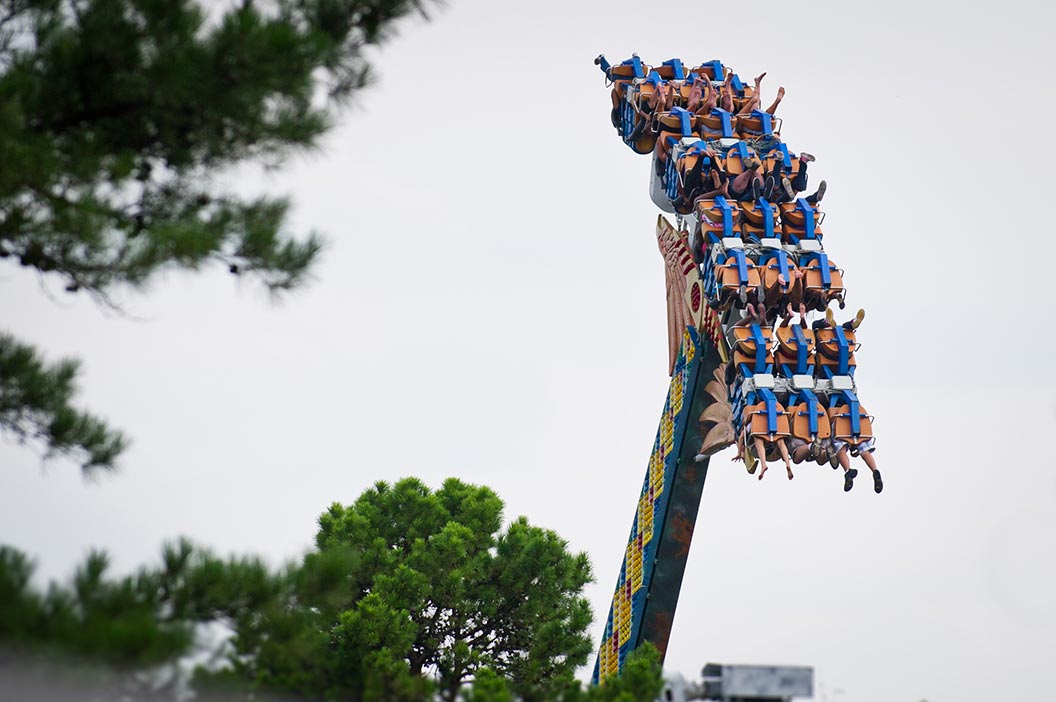 The challenge is issued the moment you gaze up to Gauntlet as you make your way toward the park’s entrance. It’s a huge, bright yellow monument to mental mayhem looping into the sky. Will you or won’t you? It takes nerves of steel to endure this 110-foot drop into a whirling dervish of five inverted loops and mind-blowing bends. You’ll feel strong side-to-side, up-and-down, and front-to-back forces traveling 2,200 feet of steel coaster insanity all while suspended under the coaster’s tracks at speeds up to 50 mph. Feet dangling, adrenaline pumping, hearts thumping…this is the very definition of a thrill ride.