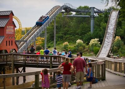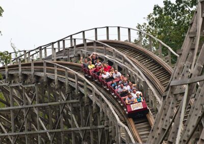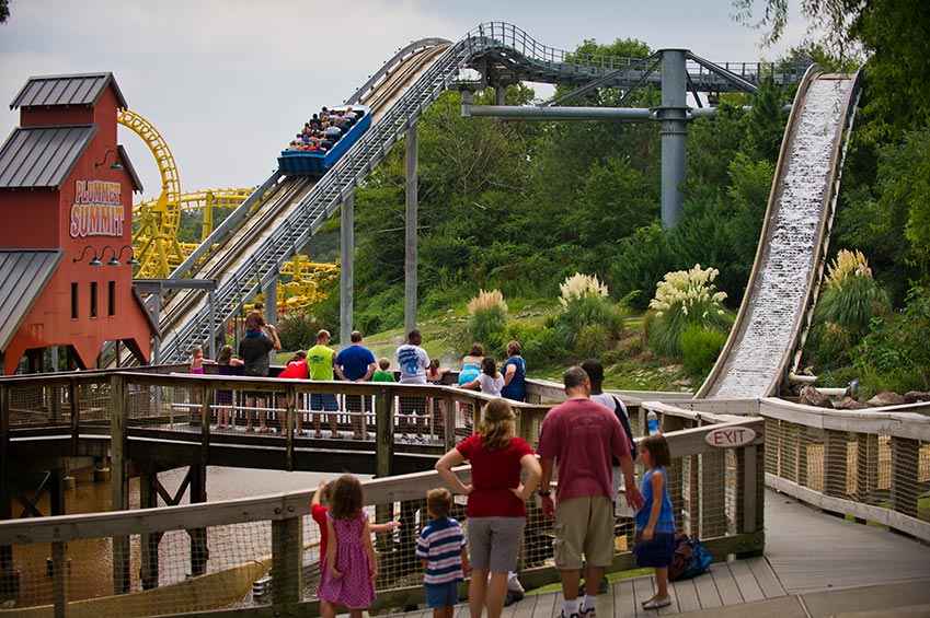 Hundreds of thousands of feet of wooden boards zig –zag high above Timberwood Amphitheater to create the park’s marquee ride – Arkansas Twister. This classic out-and-back coaster heads out of the station to transport riders to the top of its lift hill after which it releases to a 92-foot drop propelling you through an up-and-down journey across 3,500 feet of track at top speeds of 50 mph. You’ll experience the sensation of weightlessness, alternating with periods of downward force nearly three times the force of gravity!