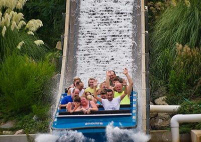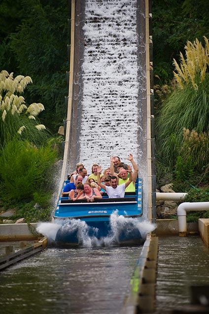 Load a raft with your best buds and hit the river – that is if you don’t mind a tidal wave! The best way to a quick cool-down in the Arkansas heat is wild dive down Plummet Summit. After a scenic ascent to the top of the lift hill, your boat is released into a wide trough, traversing a 180-degree curve, and finally tilting over the top of the 50-foot chute, quickly accelerating to 34 mph as you crash into 1,500 gallons of flowing water. The chills and spills from this one will hang around long after you’ve taken the plunge. On your way out, be sure to stop on the bridge for a fresh soaking from the next rafters headed down the river!