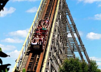 This ride was one of William L “Bill” Cobb’s many masterpieces in roller coaster engineering. Its original home was in Florida where it operated under the names Roaring Tiger and Florida Hurricane. It was a favorite ride of pop star Michael Jackson when he was on a shoot for a few weeks in that area. Magic Springs purchased the ride in 1991 and it was transported to the park, from Florida, in 40 semi-trailers. It opened in 1992 with the first ride on May 30. Since that time, multiple generations of Arkansans have shrieked and screamed up and down its track.